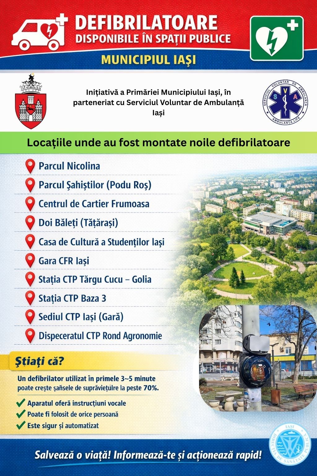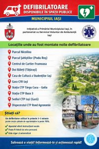 Primăria Municipiului Iași, în parteneriat cu Serviciul Voluntar de Ambulanță, anunță extinderea rețelei de defibrilatoare din municipiu prin instalarea a încă 10 defibrilatoare externe automate (DEA) în puncte strategice din oraș. Prin această inițiativă, numărul total al defibrilatoarelor disponibile în Iași crește semnificativ, consolidând infrastructura de intervenție rapidă și sporind nivelul de siguranță și protecție pentru toți cetățenii.