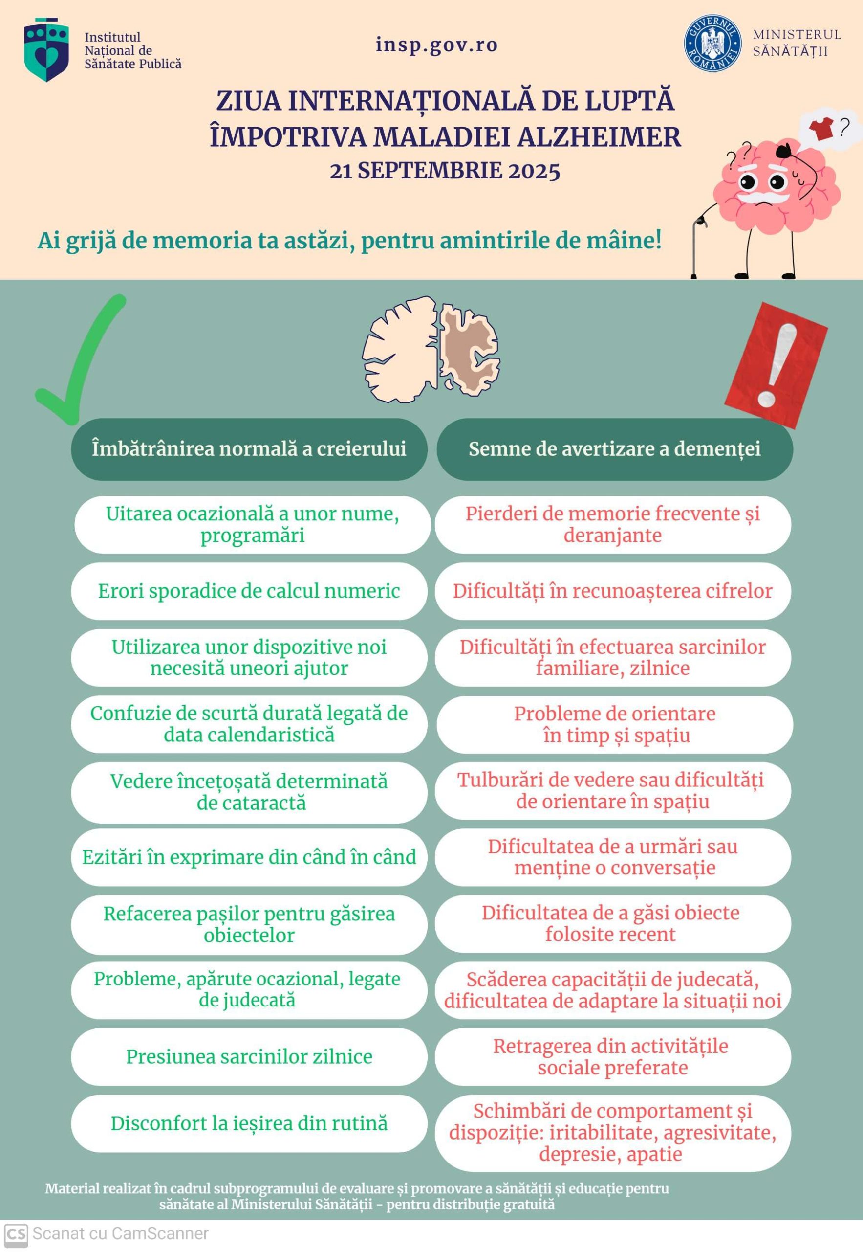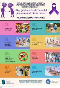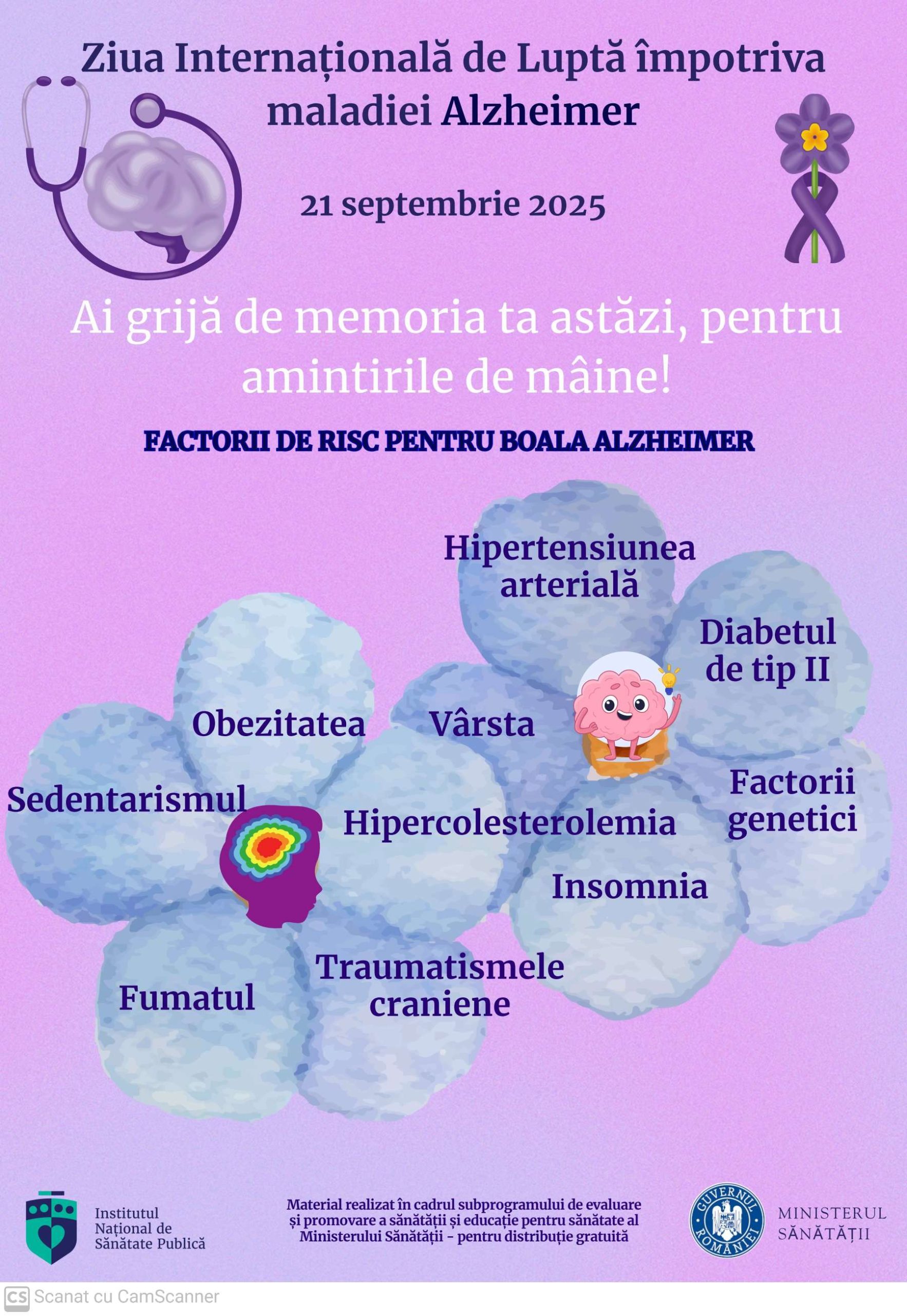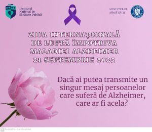 Cu ocazia Zilei Internaționale de Luptă împotriva Bolii Alzheimer, marcată anual pe data de 21 septembrie, Institutul Național de Sănătate Publică transmite un îndemn la conștientizare, prevenție și informare privind această afecțiune care afectează milioane de oameni la nivel mondial. Această zi a fost stabilită în anul 1994, sub umbrela federației internaționale, Alzheimer Disease International (ADI) și sub patronajul Organizației Mondiale a Sănătății, cu scopul de a concentra eforturile în vederea sensibilizării populaţiei generale cu privire la problematica demenţei de tip Alzheimer.