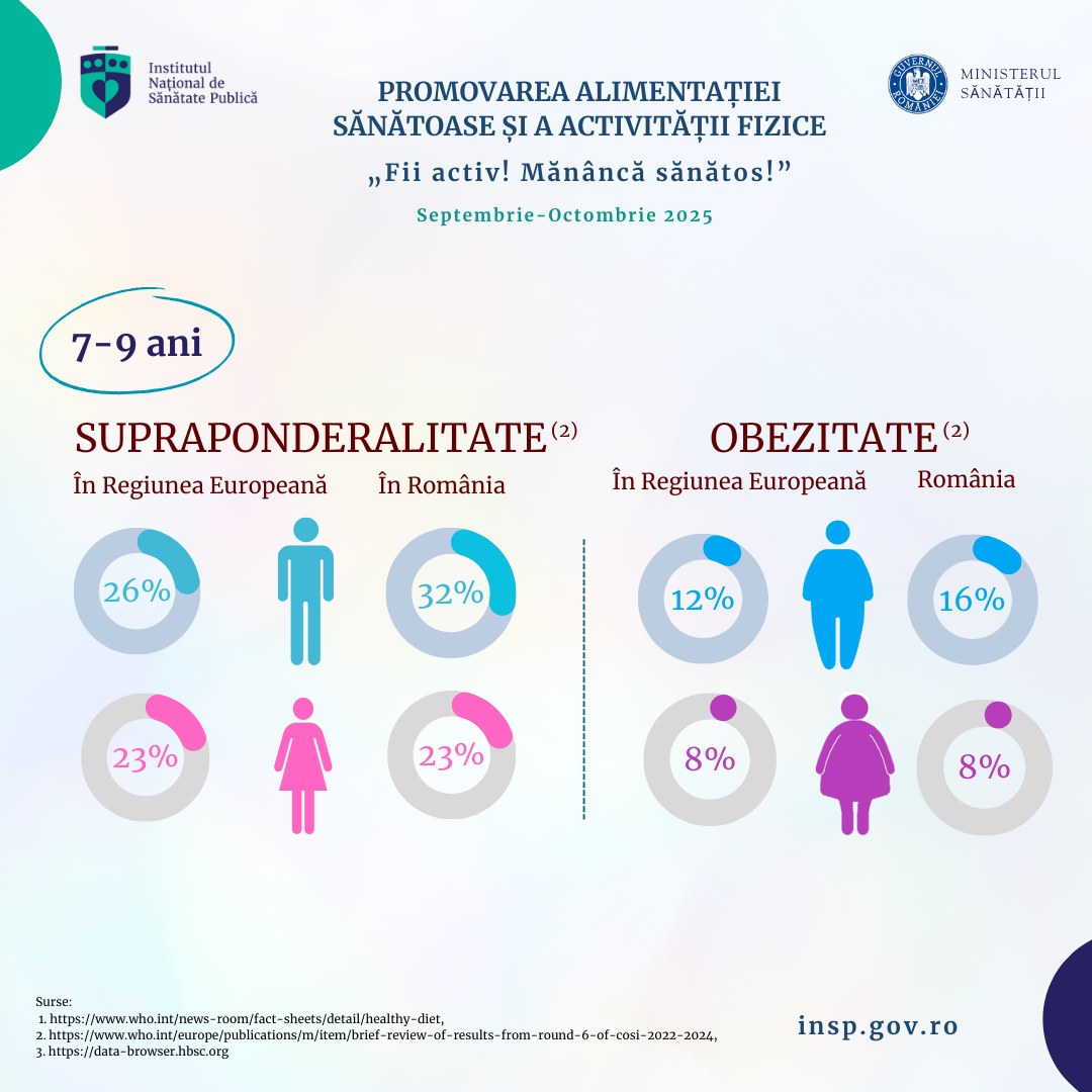 De asemenea, colectarea și analiza datelor din cadrul Inițiativei Europene de Supraveghere a Obezității în Copilărie (COSI) a OMS, efectuată în perioada 2022-2024, arată faptul că, supraponderalitatea și obezitatea în copilărie rămân o provocare importantă a sănătății publice în Regiunea Europeană a OMS. Astfel, la nivel european, aproape unul din trei copii de vârstă școlară este supraponderal și unul din opt suferă de obezitate. În România, media prevalenței supraponderalității la băieți și fete în rândul copiilor din ciclul primar (cu vârsta între 7-9 ani) este 28%, iar a obezității 12%.